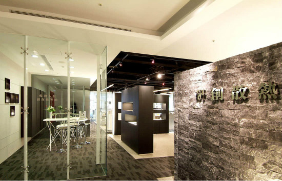 灰色花纹的瓷砖很具有沉稳的风格,和地面颜色相搭配。黑白灰格调高雅,用透明玻璃隔开走道和办公场所,顾客一入眼帘就是工作人员认真工作,信任感倍增。桌子上摆放上绿植,生活工作都小资了。